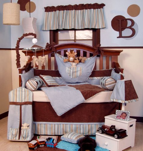 Product Details:The Baby Boy 4-piece infant bedding set is adorned with brown and blue velvet and accented with complementary stripes. Set includes Quilt, Crib Sheet, Bumper, and Dust Ruffle.**Please allow 4-6 weeks for delivery**