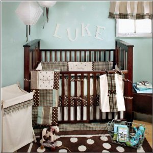 Chocolate, cream, and a light shade of blue come together in this simple yet sophisticated set. The 4 piece crib bedding set includes a quilt, skirt, bumper, and sheet. Machine washable. Bumper patchwork bumper with blue and brown plaid, tan chenille, brown dot 'baby', and blue and brown stripe fabrics. Big brown dot ties. Blanket - patchwork blanket with blue and brown plaid, tans, big brown dot fabrics. Big brown dot cording. Tan chenille for back of blanket. Skirt 15''drop tan main fabric with brown and blue stripe band with blue and brown plaid trim. Sheet - big brown dot sheet. Chocolate and teal colors in gingham, stripe, and polka dot patterns make the Mad About Plaid in Blue 4 Piece Crib Bedding Set by My Baby Sam our #1 selling boy crib ensemble! Teal and chocolate are modern yet sweet. Patchwork bumper has embroidered 'baby' and chocolate polka dot piping. Chocolate polka dot sheet is 100% cotton. Tailored 15'' skirt is double banded. 36'' by 42'' patchwork blanket has embroidered 'baby' and chocolate polka dot flange. For use with standard- sized cribs.