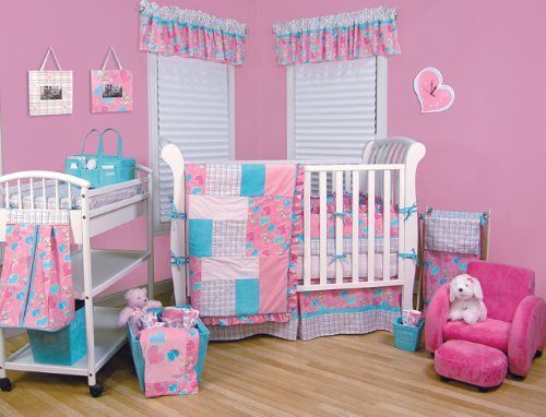 Groovy Love 4pc bedding is a collection that brings together a swirled heart, flower and peace sign print with sweet plaid and mini-dots. The girly palette of pinks along with color splashes of turquoise and lime green make this set perfect for your groovy little one. The reverse side of the quilt has pink mini-dots giving you decorating versatility in your nursery. Four piece crib bumper mirrors the quilts swirled heart and plaid designs with a ruffled top. Complete your nursery with coordinating room accessories in the Groovy Love collection.
