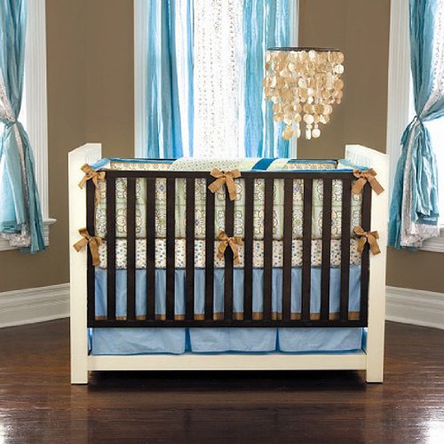 This years newest addition, The Modern-Vintage Collection. With its stylish combination of the clean, modern look that's so hot right now and a hint of urban funkiness that gives it a vintage appeal. Features: 4 individual slip-covered bumpers, ideal for conversion cribs Bumpers are 2 inches thick and at least 11 inches tall Extra long grosgrain ribbon ties keep bumpers secure while giving the bedding a clean finished look Includes: Box edge slip-covered bumpers (2 inches thick) Fitted crib sheet (28x52) 16 inch drop pleated skirt 32 inch square blanket