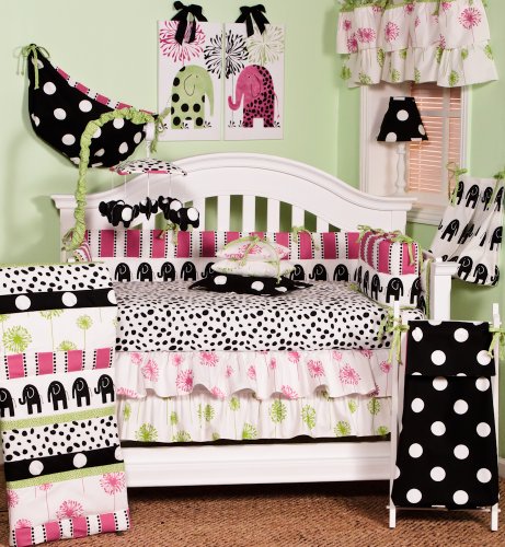 A quality baby bedding set is essential in making your nursery warm and inviting. All Cotton Tale Designs patterns are made using the finest quality materials and are uniquely designed to create an elegant and sophisticated nursery. This collection is 100% cotton. Graphic, fun, contemporary. The Hottsie Dottsie 8 piece set includes 4 piece Crib Bedding Set(bumper, crib sheet, dust ruffle, and coverlet), diaper stacker, valance, toy bag, and pillow pack. Black elephants with hot pink and green accents.