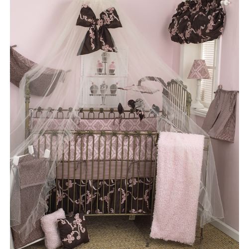 A quality baby bedding set is essential in making your nursery warm and inviting. All Cotton Tale patterns are made using the finest quality materials and are uniquely designed to create an elegant and sophisticated nursery. Cupcake 7 Piece Set includes 3 pc crib set( fitted crib sheet, dust ruffle, and coverlet), toy bag, valance, diaper stacker, and pillow pack. Cupcake is a delightful combination of pima cotton, Curly Q fleece , and roushed taffeta. All fabrics in soft pink and chocolate. The 17 inch dust ruffle is in chocolate taffeta with soft pink floral roushing. The coverlet is in soft Curly Q fleece with minky back. Fitted crib sheet is 100% cotton in pink and brown stripe. This sophisticated diaper stacker is pima cotton shirt stripe in pink and chocolate. Ties to the changer and holds up to 5 dozen newborn diapers, never tie diaper stacker, 9 x 7 x 16, to the crib. This pillow pack includes two pillows, both measuring 12 x 12, one in pink and chocolate taffeta and the other in Curly Q fleece with white button. Toy bag is 27 x 13 and can be used to store supplies, toys or can be attached to the wall as decor, never tie toy bags to the crib. Chocolate and pink roushed taffeta makes the balloon valance, measures 18" x 70". `Wash gentle cycle, separate, cold water. Tumble dry low or hang dry. This collection is perfect for your little girl. NO BUMPER INCLUDED IN THIS SET. 7 Piece Set includes a coverlet, fitted sheet, dust ruffle, toy bag, pillow pack, diaper stacker, & valance - No Bumper