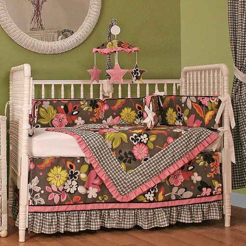 Unique and tropical, Hoohobbers Sleek Slate 4 Piece Crib Bedding Set positively blooms with a bright, impressionistic floral print in shades of pink, green, black, gold and white on a slate-grey background, accented with pure white pique, pink ruffles and black crosscheck fabrics. Made in the USA, the set includes 18Ó drop crib skirt, bumpers, double-sided blanket backed with double-knapped flannel and a fitted sheet. Machine washable.