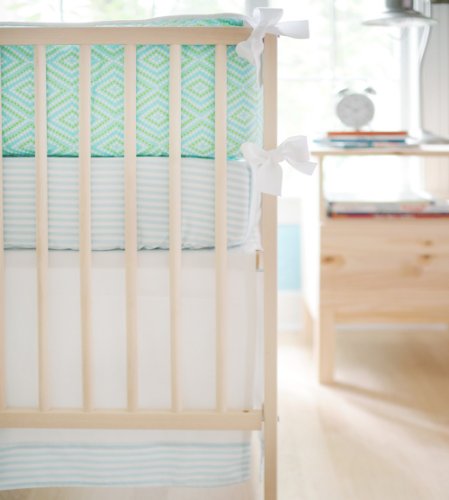 This aqua and white baby bedding will give your nursery a modern, clean look. Crisp white & hues of aqua lend a fresh feel to your new baby's room. The Moondance Baby Bedding three piece set includes bumper, sheet and skirt. The bumper is made from Zodiac fabric and White Pique cording with White Grosgrain ribbon ties. Bumper is slip covered for easy cleaning. The sheet is made from Lagoon Stripe fabric & the 17" tailored skirt is made from White Pique fabric with Zodiac pleat & Lagoon Stripe band. Handmade in the USA.