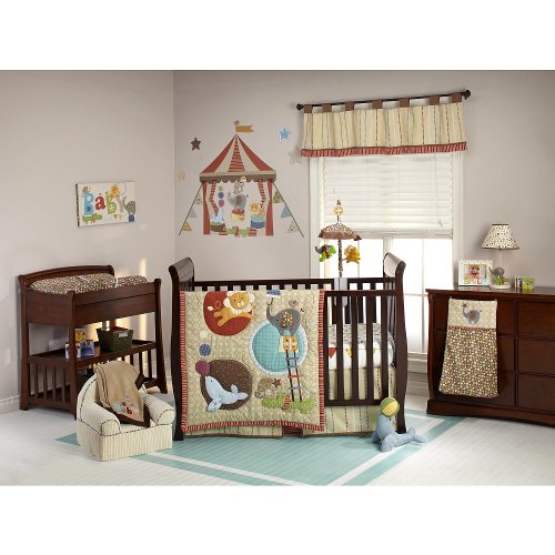 NoJo by Jill McDonald - Amazing Animals - 5-Piece Crib Set includes: appliqued comforter, fashion crib sheet, dust ruffle, window valance and diaper stacker. Come one, come all - to the greatest show on earth! Amazing Animals under the big top, featuring leaping lions, juggling seals, balancing elephants and amazing alligators and mischievous monkey. Fashion crib sheet is designed with colorful circus flag border. This collection is beautifully crafted in textured fabrics, embroidery and detailed applique. Brightly styled in circus colors of tan, turquoise, yellow, light blue, orange, red, green and a touch of brown. Coordinates with a full line of NoJo nursery decor and accessories. Crib sheet is 100% cotton. Woven fabrics are 65% Polyester/35% Cotton, 100% Polyester, 100% Polyester Suede. Machine wash separately in cold water, gentle cycle. Use only non-chlorine bleach when needed. Tumble dry on low heat. Iron on low heat when needed.