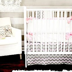The Peace, Love & Pink Bedding Set by New Arrivals has delivered another gorgeous and modern baby bedding set - a must have for your little girl This crisp, spa inspired crib bedding mixes shades of gray and pink and chevrons (zig zag pattern). The three piece set includes bumper, skirt and fitted sheet. To complete the 4 pieces add the blanket. Made in USA. 100% cotton. Machine wash/tumble dry. Fits standard size crib mattress (28" x 52").