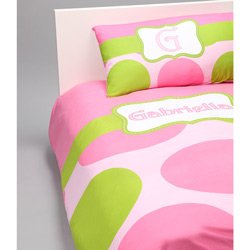 A Bright and Cheerful Addition With bright, large green and pink polka dots, this personalized toddler bedding set will create a cheerful and lively atmosphere in your little girls room. Your darling will be ecstatic with this bedding set all her own, with her very own name and initial on the duvet and pillow.