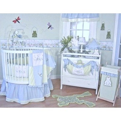 334PFRG Color: Blue Features: -Fabrics include: Cotton, and linen.-Sammy frog "panels" are embroidered.-Made in the USA. Includes: -Set includes round quilt, bumper, dust ruffle, sheet. Color/Finish: -Color: Blue and Green.
