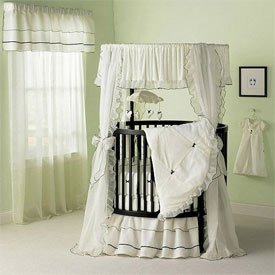 Delicate DelightThis beautiful set, made of sheer organza and crushed velour comes in both pink and ecru and is trimmed with a thin black accent. Its soft look will enhance any little kids nursery.