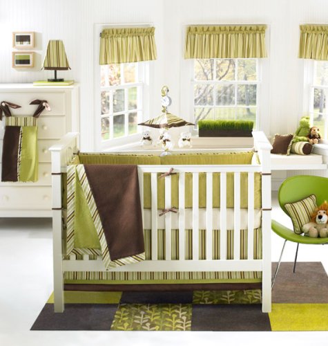 A wonderful color palette of chocolate brown and light blue Stripes make this beautiful baby bedding set perfect for your little boy. Set includes quilt, crib sheet, bumper and dust ruffle.