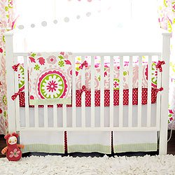 Happy, Bright, and Feminine! The Strawberry Fields Crib Bedding Set by New Arrivals combines raspberry, lime green and soft pink into a gorgeous array of color and warmth to embrace your new little addition. it's sheer decorating genious. The three piece set includes a crib bumper, sheet, and skirt. Add the coordinating blanket to complete your nursery decor. Specifications of each crib bedding piece include: