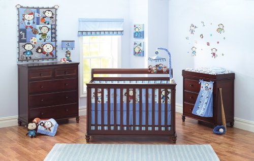 The team monkey 8 piece crib bedding set helps create a fun and dazzling environment for your little boy's nursery. The 8 piece bedding set offers a better way to sleep with an innovative 1 piece crib snug wrap that protects baby from crib slats while keeping your crib looking beautiful. Also included is the original SwaddleMe, window valance, 1 fitted sheet, crib skirt, and beautiful appliqued comforter with two comforter clips for placement as a wall design.