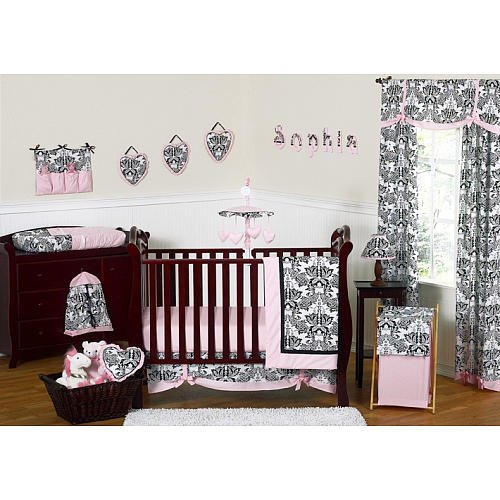 - Sophia 11pc Crib Bedding Set has all that your little bundle of joy will need. Let the little one in your home settle down to sleep in this incredible nursery set. This stylish designer girls bedding set features an exclusive black and white Sweet Jojo Designs damask print offset with baby pink borders. This uses the stylish colors of Pink, Black and Crisp White. The design uses 100% cotton fabric that is machine washable for easy care. This wonderful set will fit all cribs and toddler beds. Crib set includes: Crib Comforter, Fitted Sheet, Crib Skirt (Dust Ruffle), Diaper Stacker, Toy Bag, Decorative Pillow, Set of 3 Wall Hangings and 2 Window Valances.