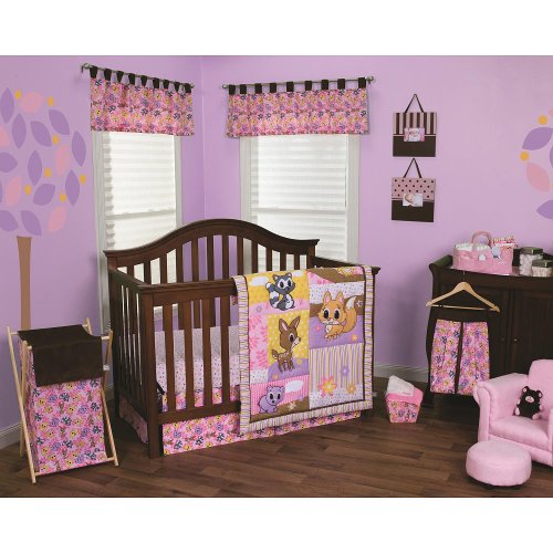Discover the beautiful wilderness with Lola Fox! Trend Lab's Lola Fox and Friends 6-Piece Crib Bedding Set features Lola Fox with her adorable baby woodland friends interacting in a delightful patch-like scene. Decorative quilting stitches add a gorgeous flair, bringing the cute little critters to life, while a variegated stripe frame and chocolate trim add detail and dimension to this adorable group. Dress up your nursery with beautiful prints and endearing characters featured in a fashionable color palette of bubblegum and hot pink, violet, caramel, cantaloupe and buttercup, with cinnamon, oak and slate accents. Set includes quilt, printed crib sheet, solid crib sheet, skirt, window valance and diaper stacker.Quilt measures 35"" x 42? and features charming little critters in a patch-like scene on the front and a baby woodland animal scatter print on the back providing decorating versatility. Printed crib sheet features a lovely white based mini floral print in bubblegum and hot pink, violet, cantaloupe, buttercup and slate. Solid pink and printed sheets fit a standard 52? x 28? crib mattress and have 8? deep pockets with elastic surrounding the entire opening ensuring a more secure fit. Box Pleat Skirt with 13.5"" drop features an adorable baby woodland animal scatter print in a lovely color palette of bubblegum and hot pink, violet, caramel, cantaloupe, and buttercup.Window valance measures 53? x 15"" and features a baby woodland animal scatter print in violet, cantaloupe, slate, caramel, and buttercup yellow on a bubblegum and hot pink tonal leaf background. Diaper stacker body features a baby woodland animal scatter print in violet, cantaloupe, slate, caramel, and buttercup yellow on a bubblegum and hot pink tonal leaf background with chocolate brown ultrasuede on the top panel and trim. Measures 12? x 8? x 20.25"". Coordinating Lola Fox and Friends Crib Bumpers and room accessories by Trend Lab are sold separately.