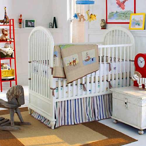 Box Bumper: A refined bumper with all of our adventure scenes miniaturized and intricately embroidered. 240 thread-count 100% cotton sateen with contrast piping and khaki border. Reverses to multicolored adventure stripe with khaki grround. Brown piping and ties carefully placed to safely secure bumper to crib. Hand tufted.